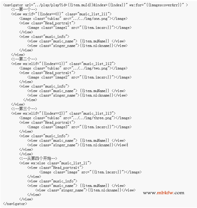 上面是个列表从数据库拿下来所有的信息;在视图层直接一个for循环展示下来,现在麻烦来了前三个和后面的额不一样,小程序不允许dom操作,那怎么解决呢?