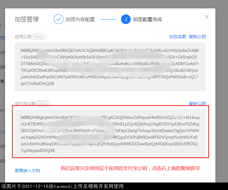 5、保存后自动生成,这里我们只会用到支付宝公钥,点击右上角复制公钥