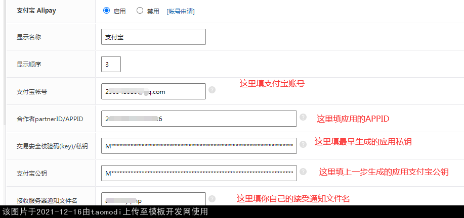 7、打开后台,设置相应的秘钥参数,这里我们要用到的是APPID和第2步的应用私钥和第4步的支付宝公钥: