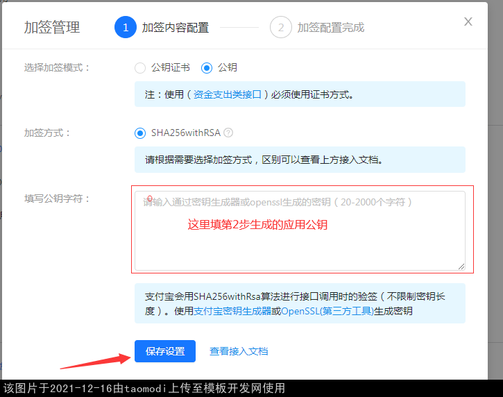 4、将刚才生成的 应用公钥 复制到设置里保存,他会自动生成相应的秘钥