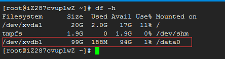 磁盘挂载大功告成,然后输入命令df -h查看,就能看到/dev/xvdb1已经挂在到/data0目录下了,以后cd /data0其实就是访问这块数据盘,而不是系统盘了,我们可以将网站和数据库以及日志等容易占用磁盘空间的文件放在这里