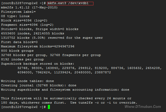 紧接着输入命令mkfs.ext3 /dev/xvdb1,格式化磁盘,耐心等待即可