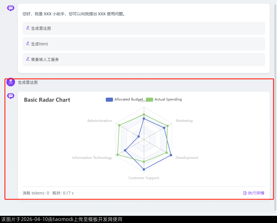 return json.dumps({'actionType': 'EVAL', 'option': option, 'style': {'height': '300px', 'width': '100%'}})其中,可以从https://echarts.apache.org/ 官网选择自己喜欢的模版, 替换option当中的值。