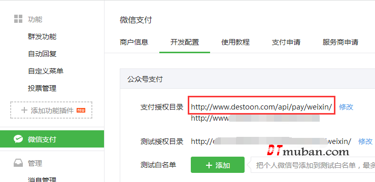 设置支付授权目录,例如网站首页为https://www.destoon.com/,则填写https://www.destoon.com/api/pay/weixin/