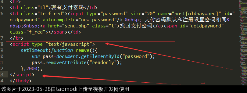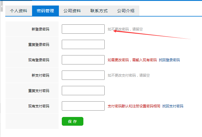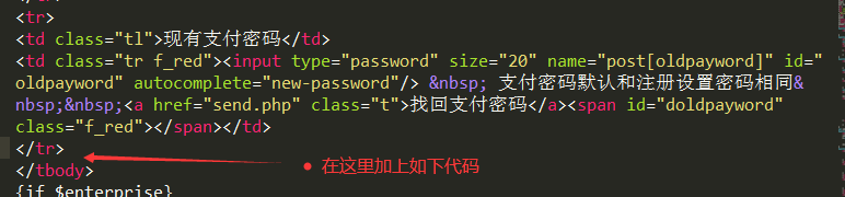<td class="tr f_red"><input type="password" size="20" name="post[oldpayword]" id="oldpayword" autocomplete="new-password"/> 支付密码默认和注册设置密码相同 <a href="send.php" class="t">找回支付密码</a><span id="doldpayword" class="f_red"></span></td>