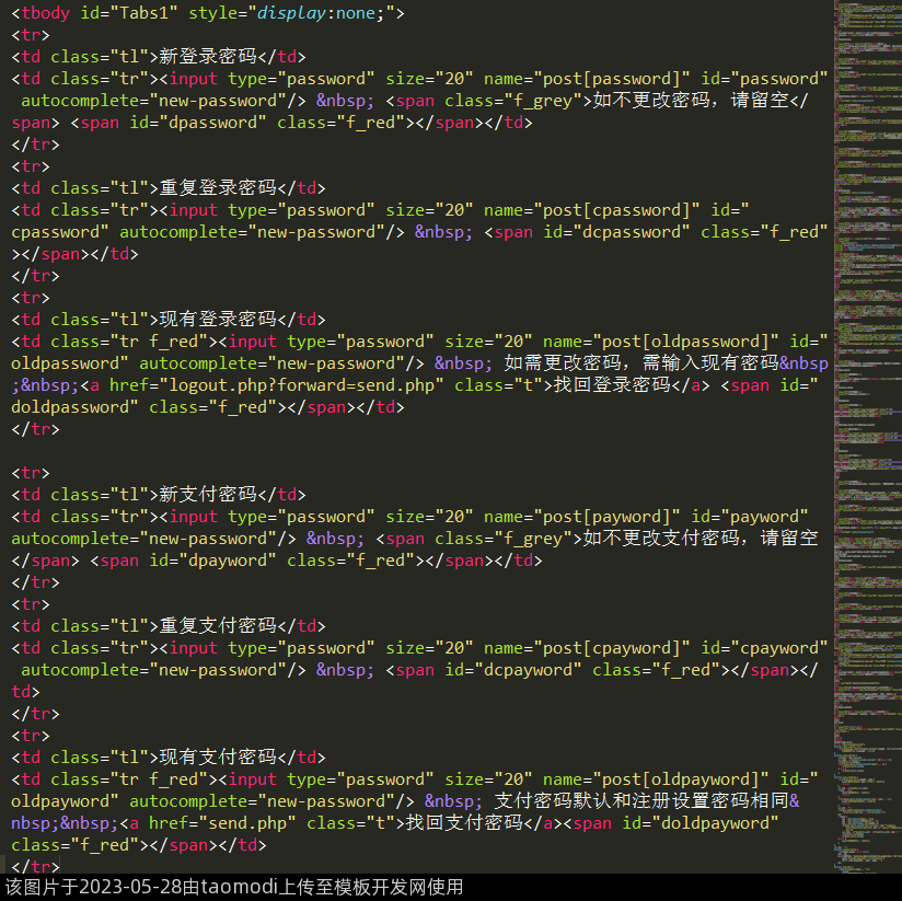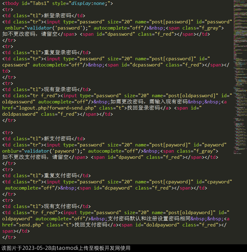 <td class="tr"><input type="password" size="20" name="post[payword]" id="payword" autocomplete="new-password"/> <span class="f_grey">如不更改支付密码,请留空</span> <span id="dpayword" class="f_red"></span></td>