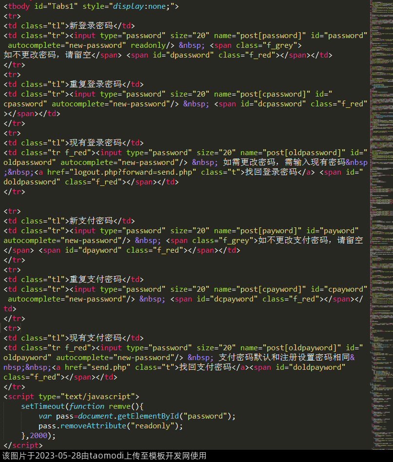 <td class="tr"><input type="password" size="20" name="post[password]" id="password" autocomplete="new-password" readonly/> <span class="f_grey">如不更改密码,请留空</span> <span id="dpassword" class="f_red"></span></td>