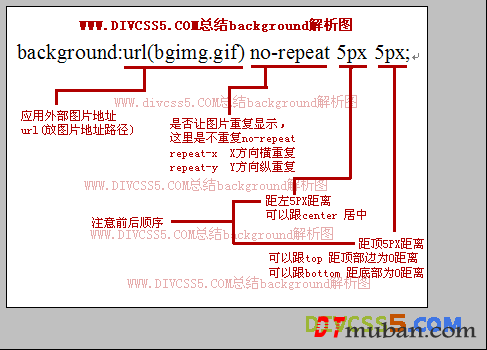 从图上的CSS background解析图我们可以详细了解到background的css属性使用方法。
