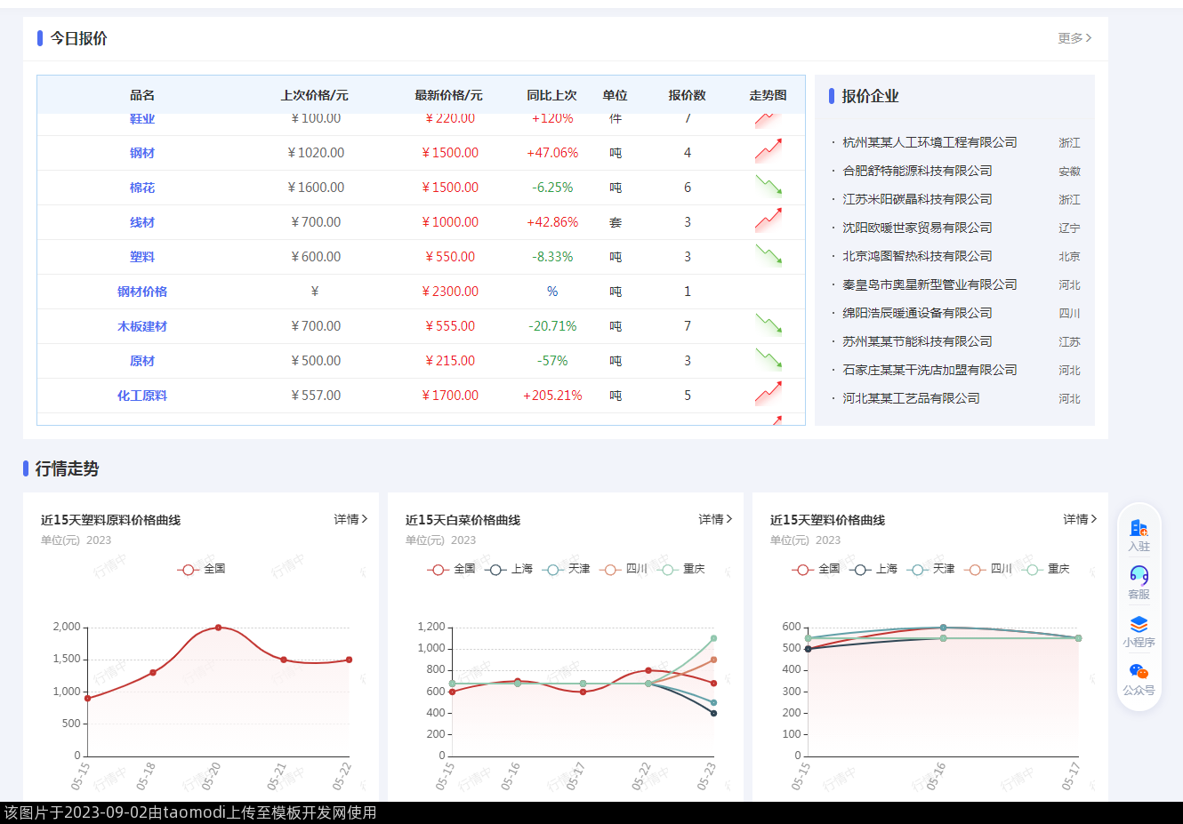 1、开发的模块有:主首页,供应模块,商城模块,采购模块,公司模块,品牌模块,招商模块,展会模块,视频模块,人才模块,商圈模块,资讯模块,行情模块,网站地图,网站留言,积分换礼,排名推广,会员注册和登录页面,关于我们系列的单页面,重点是商务中心加入了新的布局和元素。